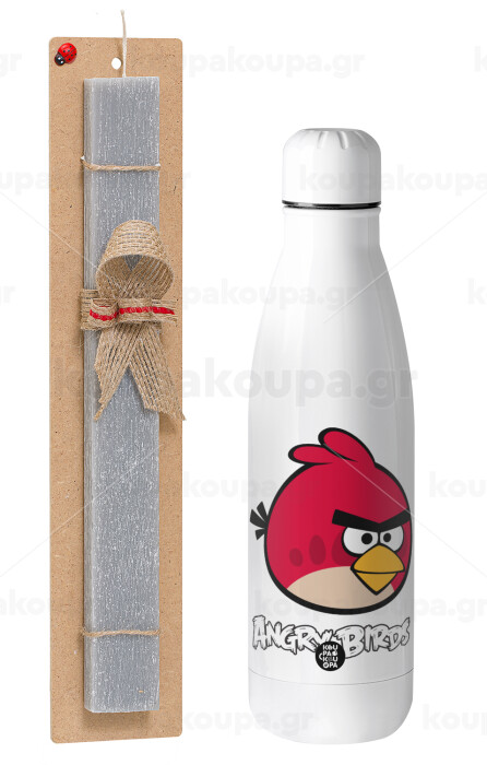 Angry birds Terence, Easter Set, metallic stainless thermos bottle (500ml) & scented flat Easter candle (30cm) (GRAY)