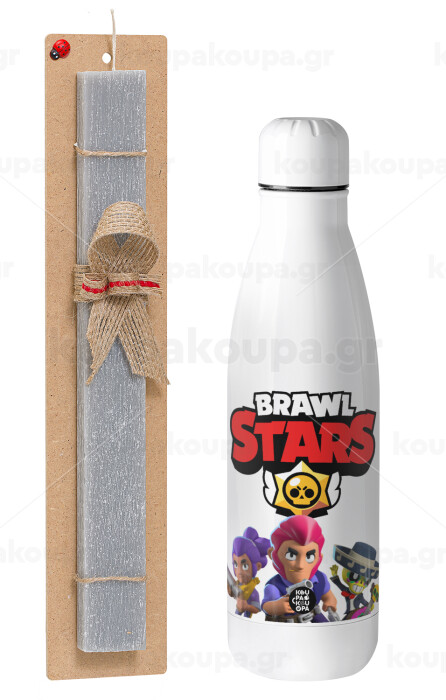 Brawl Stars Blue, Easter Set, metallic stainless thermos bottle (500ml) & scented flat Easter candle (30cm) (GRAY)