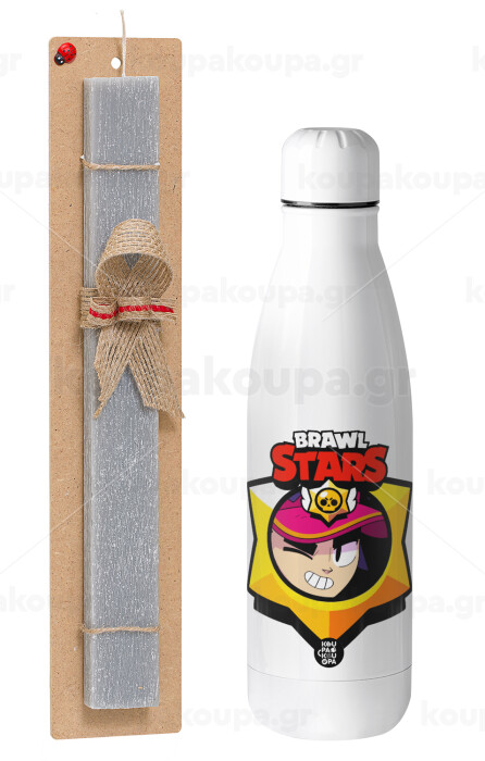 Brawl Stars Fang, Easter Set, metallic stainless thermos bottle (500ml) & scented flat Easter candle (30cm) (GRAY)