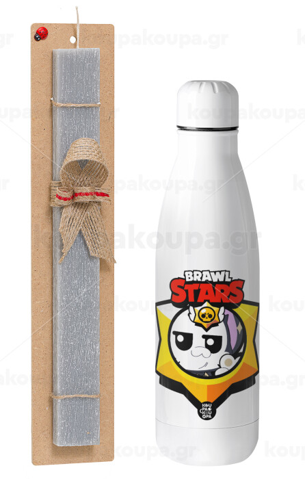 Brawl Stars Kit, Easter Set, metallic stainless thermos bottle (500ml) & scented flat Easter candle (30cm) (GRAY)
