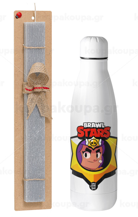 Brawl Stars Shelly, Easter Set, metallic stainless thermos bottle (500ml) & scented flat Easter candle (30cm) (GRAY)