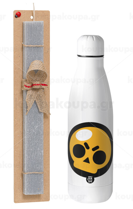 Brawl Stars Skull, Easter Set, metallic stainless thermos bottle (500ml) & scented flat Easter candle (30cm) (GRAY)