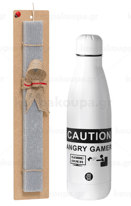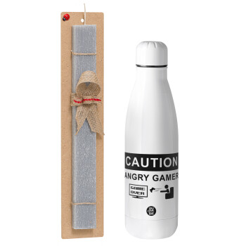Caution, angry gamer!, Easter Set, metallic stainless thermos bottle (500ml) & scented flat Easter candle (30cm) (GRAY)