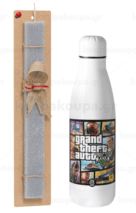 GTA V, Easter Set, metallic stainless thermos bottle (500ml) & scented flat Easter candle (30cm) (GRAY)