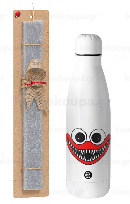 Huggy wuggy, Easter Set, metallic stainless thermos bottle (500ml) & scented flat Easter candle (30cm) (GRAY)
