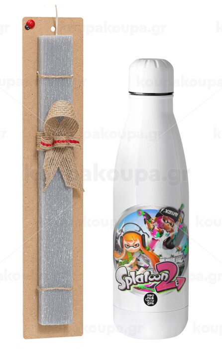 Splatoon 2, Easter Set, metallic stainless thermos bottle (500ml) & scented flat Easter candle (30cm) (GRAY)