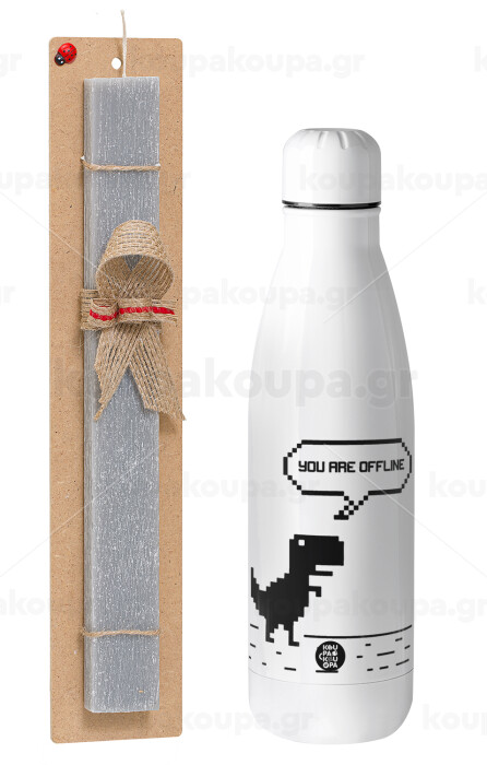 You are offline dinosaur, Easter Set, metallic stainless thermos bottle (500ml) & scented flat Easter candle (30cm) (GRAY)