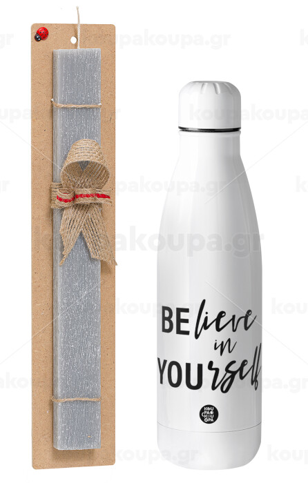 Believe in your self, Easter Set, metallic stainless thermos bottle (500ml) & scented flat Easter candle (30cm) (GRAY)