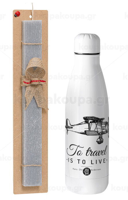 To travel is to live, Easter Set, metallic stainless thermos bottle (500ml) & scented flat Easter candle (30cm) (GRAY)