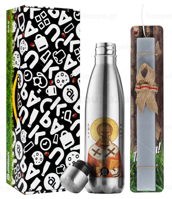 Saint Nicholas orthodox , Easter Set, metallic stainless thermos flask (500ml) & scented flat Easter candle (30cm) (GRAY)