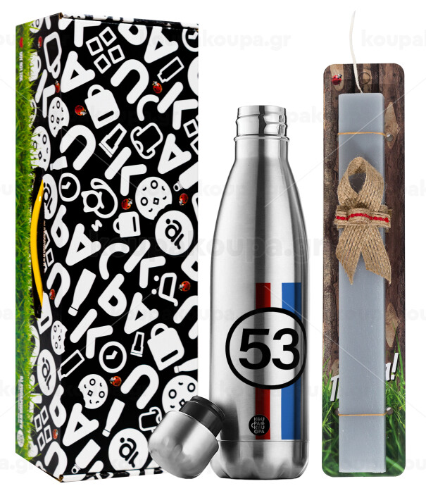 VW Herbie 53, Easter Set, metallic stainless thermos flask (500ml) & scented flat Easter candle (30cm) (GRAY)