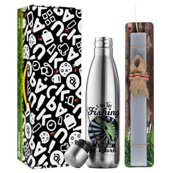 A bad day FISHING is better than a good day at work, Easter Set, metallic stainless thermos flask (500ml) & scented flat Easter candle (30cm) (GRAY)