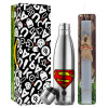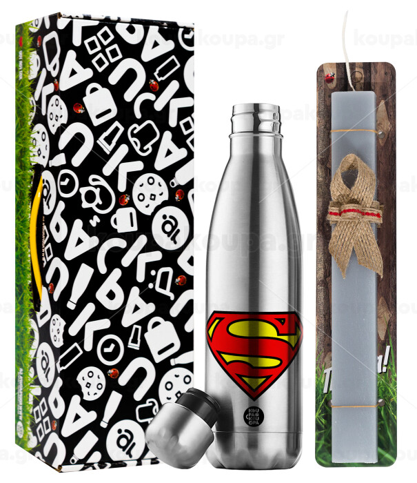 Superman vintage, Easter Set, metallic stainless thermos flask (500ml) & scented flat Easter candle (30cm) (GRAY)