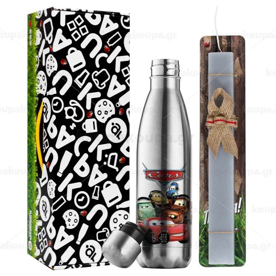 Αυτοκίνητα, Easter Set, metallic stainless thermos flask (500ml) & scented flat Easter candle (30cm) (GRAY)