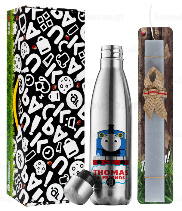 Τόμας το τρενάκι, Easter Set, metallic stainless thermos flask (500ml) & scented flat Easter candle (30cm) (GRAY)