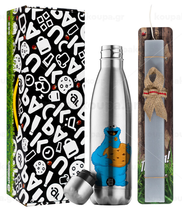 Cookie Monster, Easter Set, metallic stainless thermos flask (500ml) & scented flat Easter candle (30cm) (GRAY)