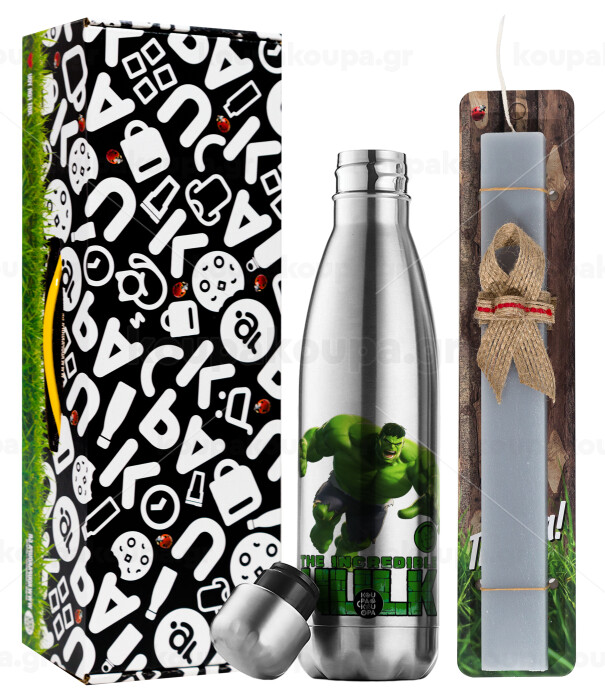 Hulk, Easter Set, metallic stainless thermos flask (500ml) & scented flat Easter candle (30cm) (GRAY)
