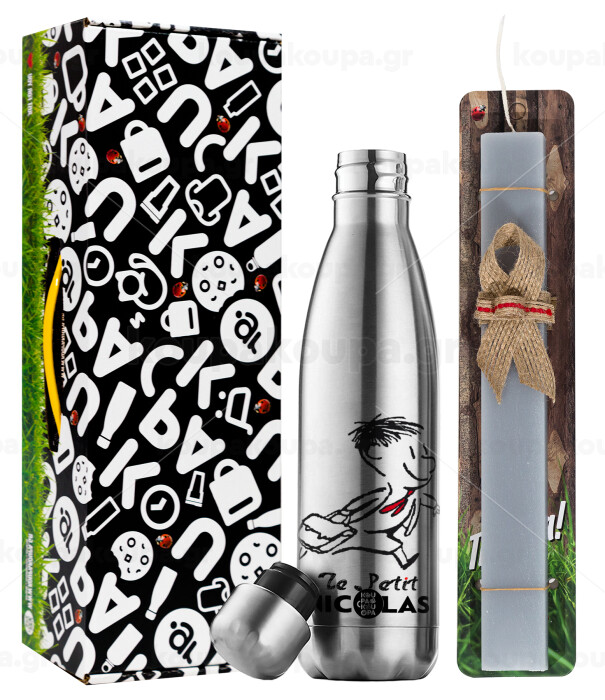 Le Petit Nicolas, Easter Set, metallic stainless thermos flask (500ml) & scented flat Easter candle (30cm) (GRAY)