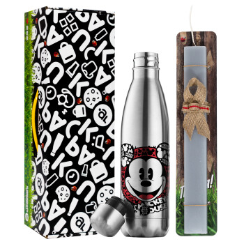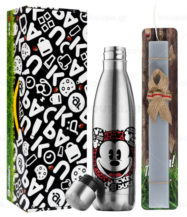 Mickey Mouse, Easter Set, metallic stainless thermos flask (500ml) & scented flat Easter candle (30cm) (GRAY)