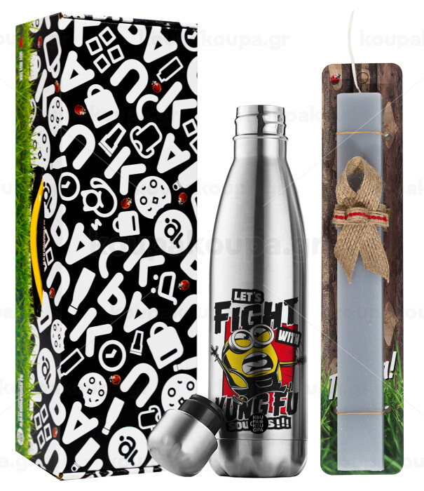 Minions Let's fight with kung fu sounds, Easter Set, metallic stainless thermos flask (500ml) & scented flat Easter candle (30cm) (GRAY)