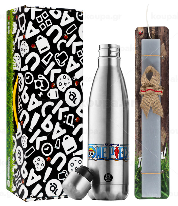 Onepiece logo, Easter Set, metallic stainless thermos flask (500ml) & scented flat Easter candle (30cm) (GRAY)