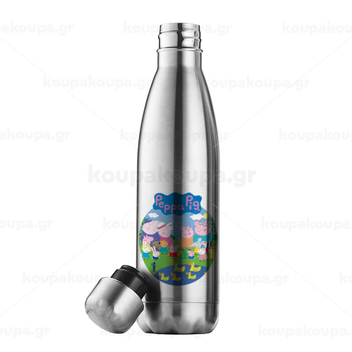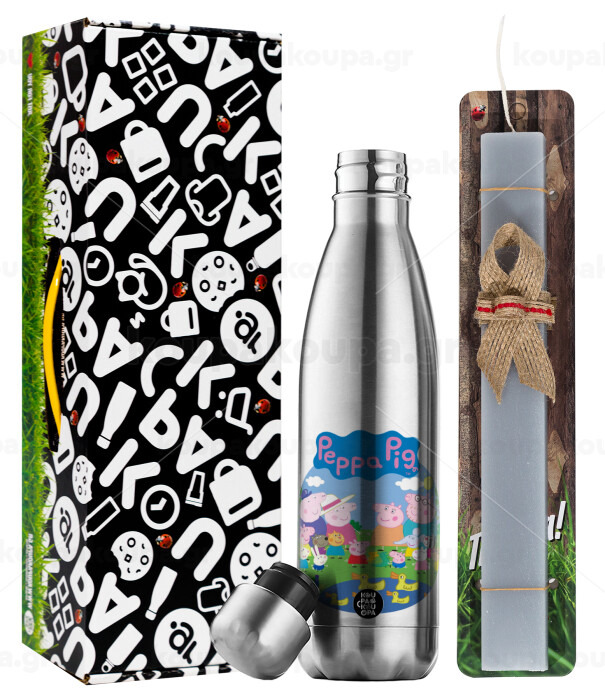 Peppa pig Family, Easter Set, metallic stainless thermos flask (500ml) & scented flat Easter candle (30cm) (GRAY)