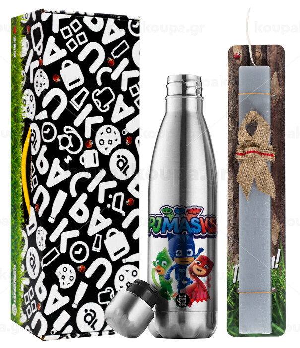 PJ masks, Easter Set, metallic stainless thermos flask (500ml) & scented flat Easter candle (30cm) (GRAY)