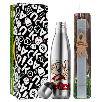 Popeye the sailor man, Easter Set, metallic stainless thermos flask (500ml) & scented flat Easter candle (30cm) (GRAY)