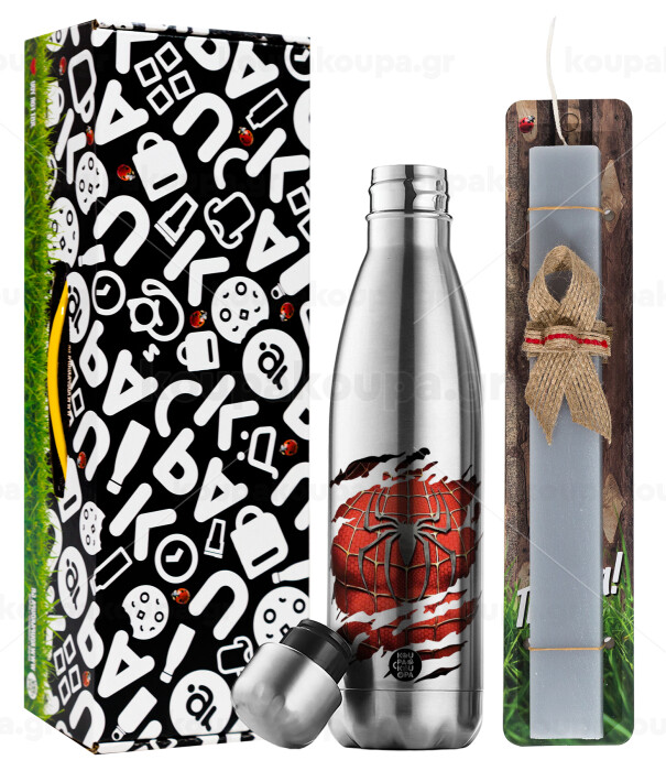 Spiderman cracked, Easter Set, metallic stainless thermos flask (500ml) & scented flat Easter candle (30cm) (GRAY)