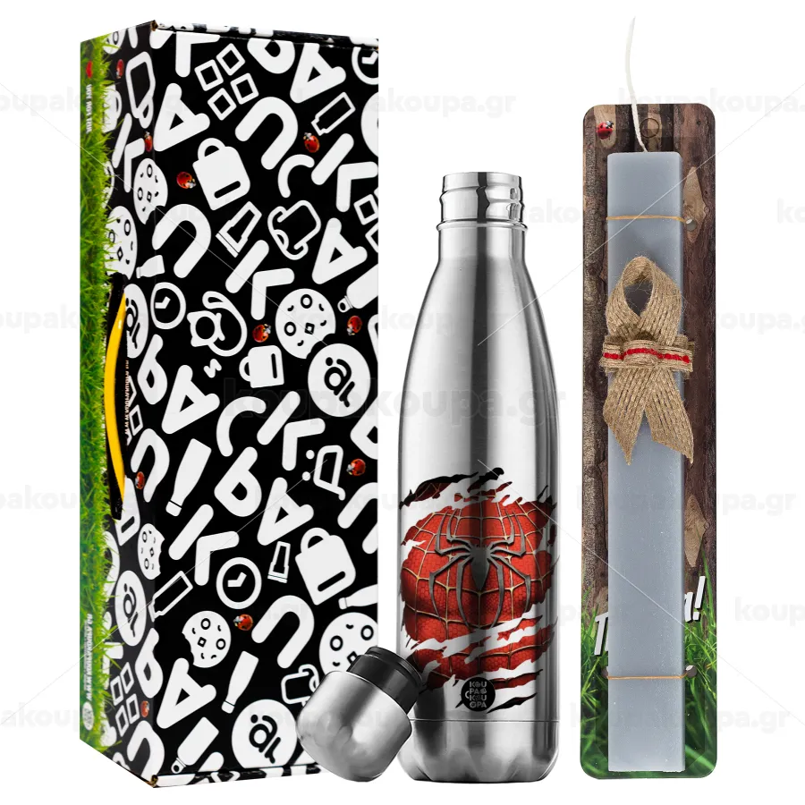 Spiderman cracked, Easter Set, metallic stainless thermos flask (500ml) & scented flat Easter candle (30cm) (GRAY)