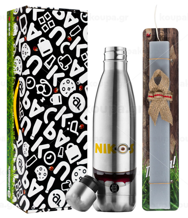 The minions, Easter Set, metallic stainless thermos flask (500ml) & scented flat Easter candle (30cm) (GRAY)