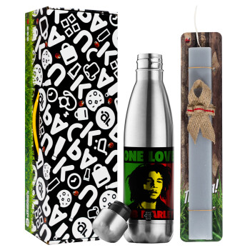 Bob marley, one love, Easter Set, metallic stainless thermos flask (500ml) & scented flat Easter candle (30cm) (GRAY)