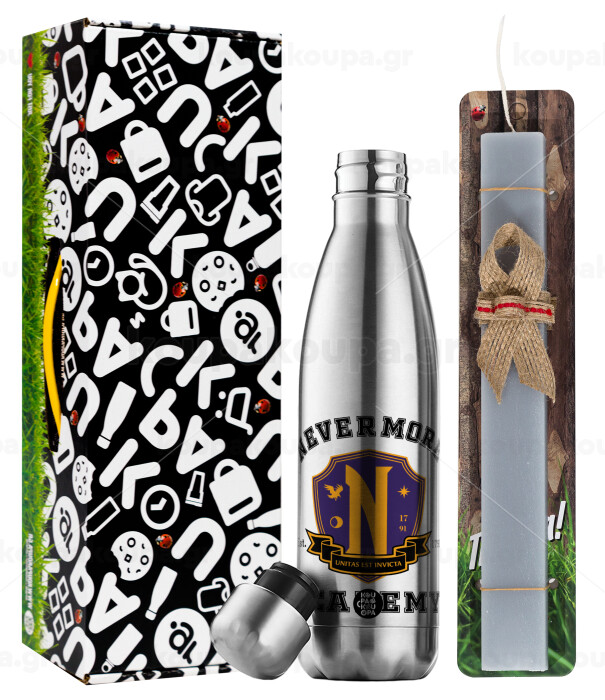 Wednesday Nevermore Academy University, Easter Set, metallic stainless thermos flask (500ml) & scented flat Easter candle (30cm) (GRAY)