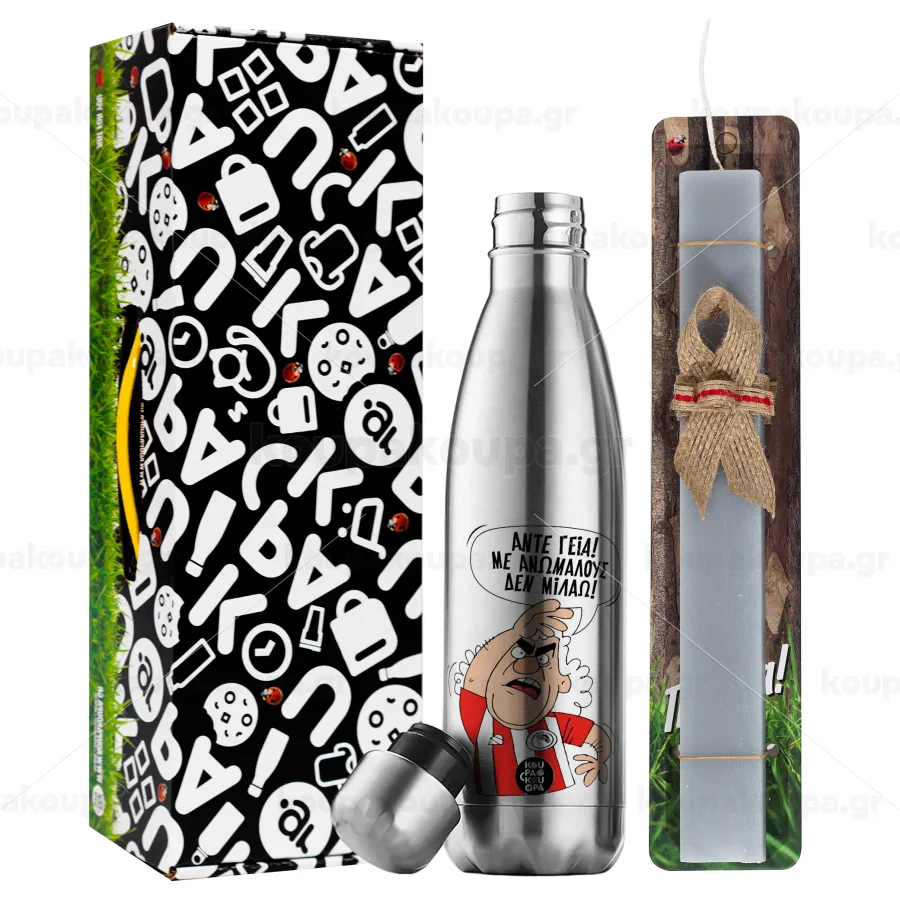 Τάκης, Άντε γεια, με ανώμαλους δεν μιλάω!, Easter Set, metallic stainless thermos flask (500ml) & scented flat Easter candle (30cm) (GRAY)