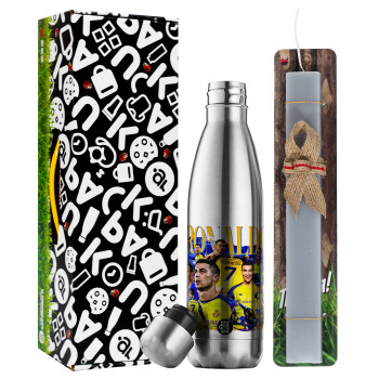 Cristiano Ronaldo Al Nassr, Easter Set, metallic stainless thermos flask (500ml) & scented flat Easter candle (30cm) (GRAY)
