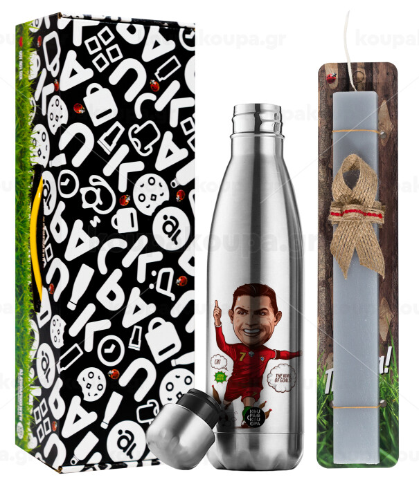 Cristiano Ronaldo, Easter Set, metallic stainless thermos flask (500ml) & scented flat Easter candle (30cm) (GRAY)