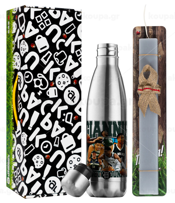 Giannis Antetokounmpo, Easter Set, metallic stainless thermos flask (500ml) & scented flat Easter candle (30cm) (GRAY)