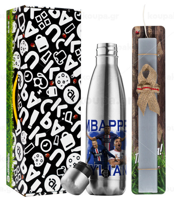 Kylian Mbappé, Easter Set, metallic stainless thermos flask (500ml) & scented flat Easter candle (30cm) (GRAY)