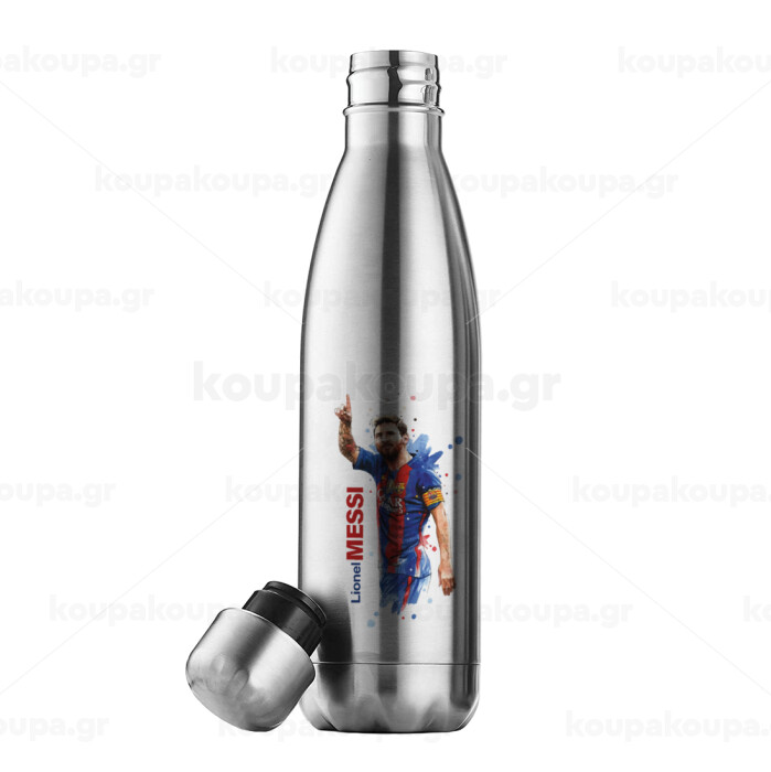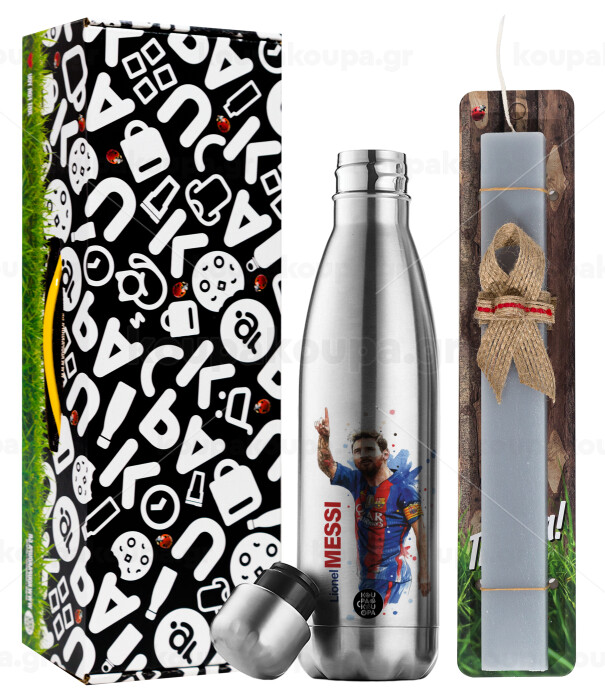 Lionel Messi, Easter Set, metallic stainless thermos flask (500ml) & scented flat Easter candle (30cm) (GRAY)