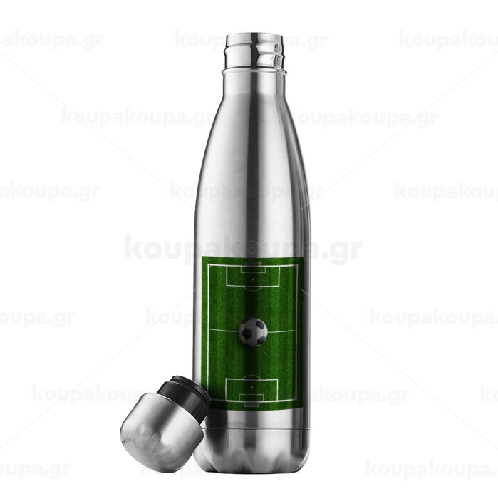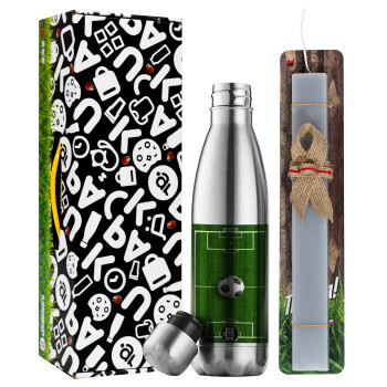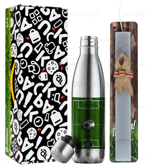 Soccer field, Γήπεδο ποδοσφαίρου, Easter Set, metallic stainless thermos flask (500ml) & scented flat Easter candle (30cm) (GRAY)