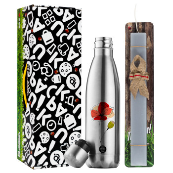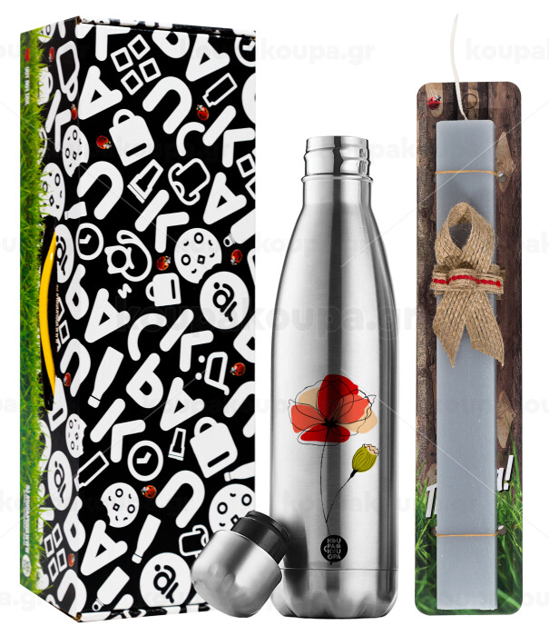 Red poppy flowers papaver, Easter Set, metallic stainless thermos flask (500ml) & scented flat Easter candle (30cm) (GRAY)