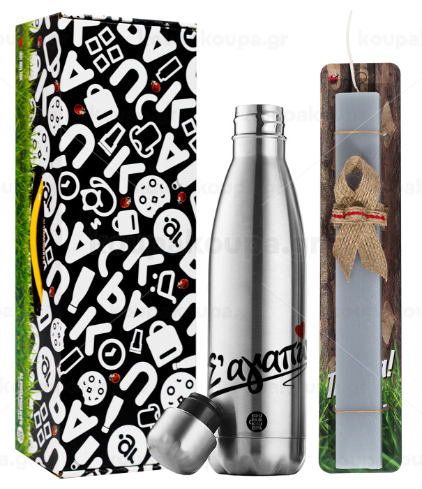 Σ΄ αγαπώ!!!, Easter Set, metallic stainless thermos flask (500ml) & scented flat Easter candle (30cm) (GRAY)