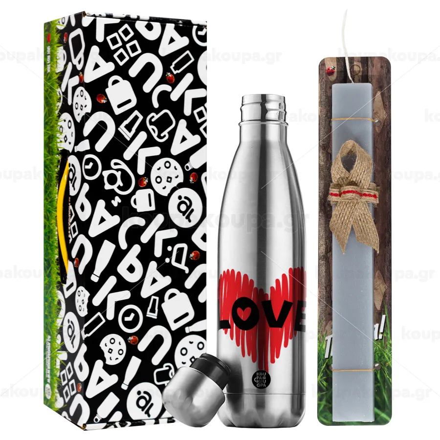 I Love You red heart, Easter Set, metallic stainless thermos flask (500ml) & scented flat Easter candle (30cm) (GRAY)