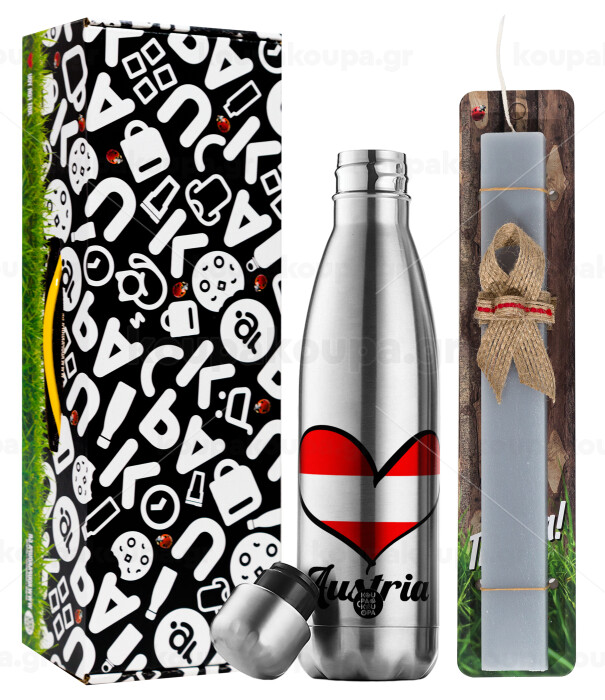 Austria flag, Easter Set, metallic stainless thermos flask (500ml) & scented flat Easter candle (30cm) (GRAY)