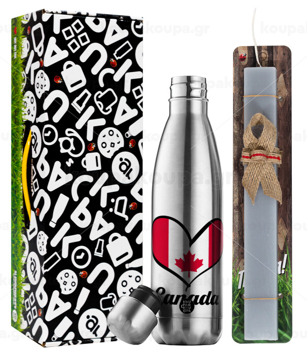 Canada flag, Easter Set, metallic stainless thermos flask (500ml) & scented flat Easter candle (30cm) (GRAY)
