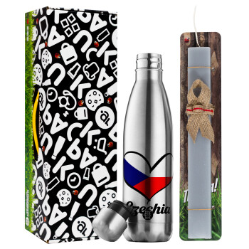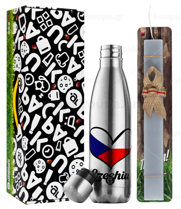 Czechia flag, Easter Set, metallic stainless thermos flask (500ml) & scented flat Easter candle (30cm) (GRAY)