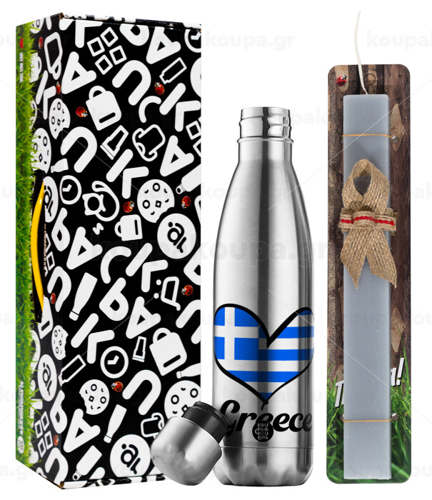 Greece flag, Easter Set, metallic stainless thermos flask (500ml) & scented flat Easter candle (30cm) (GRAY)