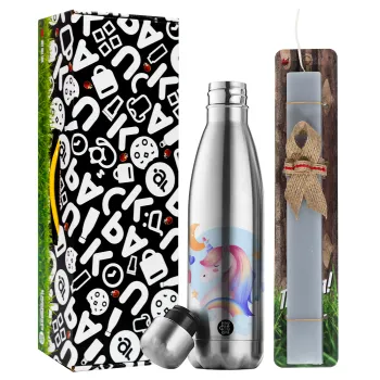 Cute unicorn, Easter Set, metallic stainless thermos flask (500ml) & scented flat Easter candle (30cm) (GRAY)