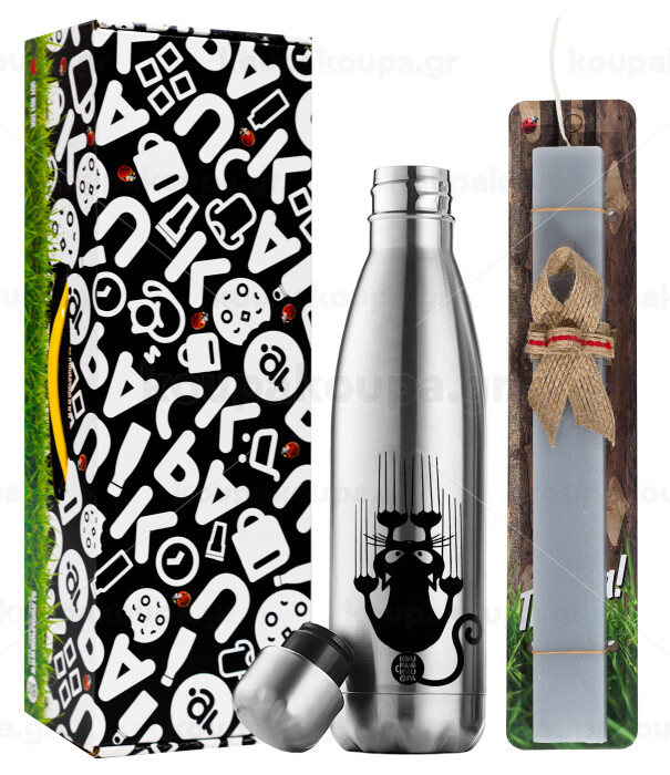 Cat scratching, Easter Set, metallic stainless thermos flask (500ml) & scented flat Easter candle (30cm) (GRAY)
