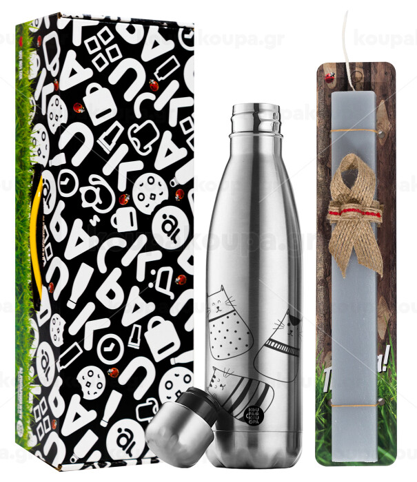 Cute cats, Easter Set, metallic stainless thermos flask (500ml) & scented flat Easter candle (30cm) (GRAY)